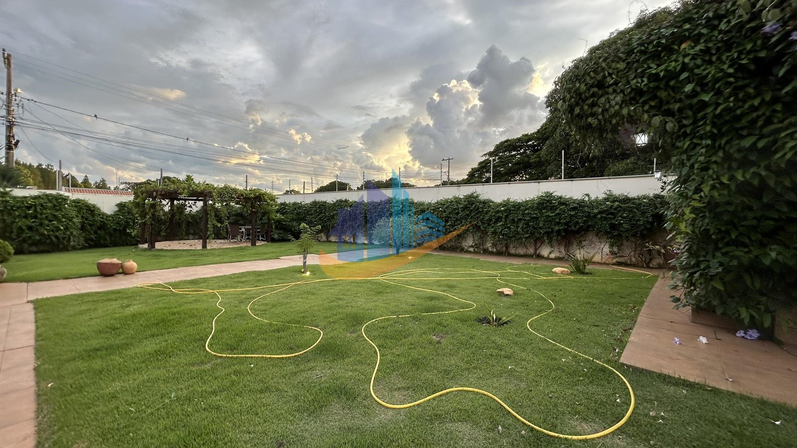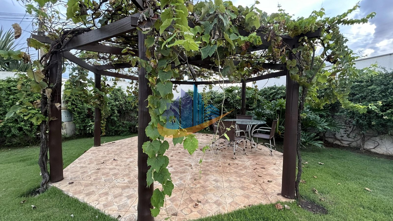 Amplo jardim com parreiras de uva